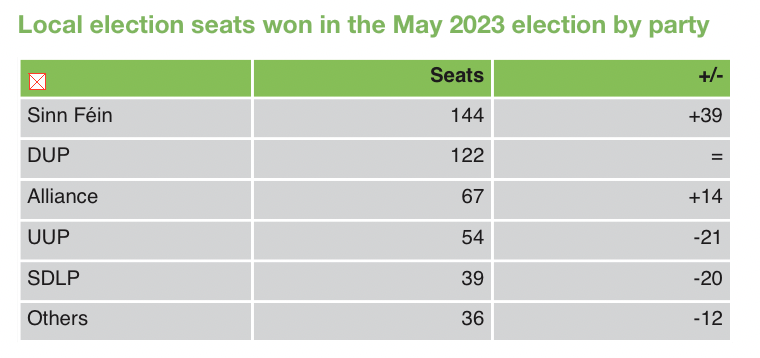 The scale of Sinn Féin’s success cannot be overstated, with the party having surged by 7 per cent between the 2019 and 2023 elections, and now holding 144 of Northern Ireland’s 462 local government seats. This is the highest number of seats held by a single party since the formation of Northern Ireland’s super councils.