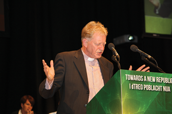 Despite the fact that Sinn Féin is an all- Ireland party, there remained a slight sense of disparity between MLAs who were focused on the Executive and TDs who were in opposition mode, attacking the Irish Government’s acquiescence to the EU-IMF bailout. Also, while McGuinness referred to unionists as “brothers and sisters to be loved and cherished as we travel on our journey to a new Republic,” Gerry Adams harkened to the party’s more traditional rhetoric, saying: “The Orange state is no more.