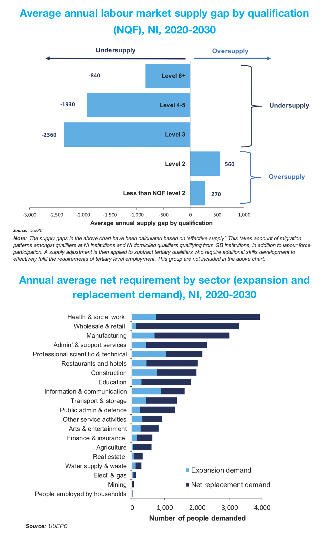 The past two years has seen a recognised rise in levels of retention within the education system and attainment across all levels of the education system. While this has an effect of reducing the annual flow of qualifiers into the labour market, it is most pronounced in occupations and sectors typically associated with lower levels of graduate employment. According to the Skills Barometer: “The overall supply of qualifications in Northern Ireland remains characterised by a ‘missing middle’, with relatively few mid-level skills provided by the education system which directly transition to the labour market.”