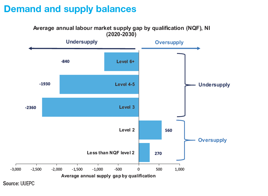 “The overall supply of qualifications in Northern Ireland remains characterised by a ‘missing middle’, with relatively few mid-level skills provided by the education system which directly transition to the labour market,” the barometer states.