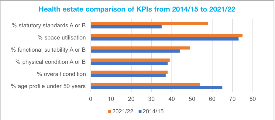 An assessment of the efficiency and effectiveness of circa 1,500 buildings (individual estate owned, occupied, and managed by each of the six Health and Social Care [HSC] trusts and the Northern Ireland Fire and Rescue Service [NIFRS]) found that 42 per cent of the £3.5 billion-valued estate is not fully compliant with statutory regulations, with 21 per cent classed as unacceptable for physical condition.