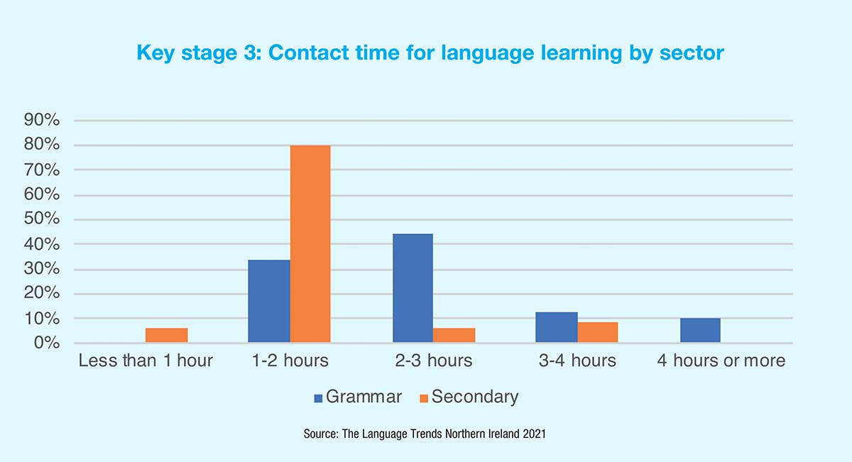 Northern Ireland currently has the shortest timeframe for compulsory language learning in any country in the continent of Europe (Key Stage 3, ages 11-14) and there is no guidance from government on how much time should be spent on language learning.
