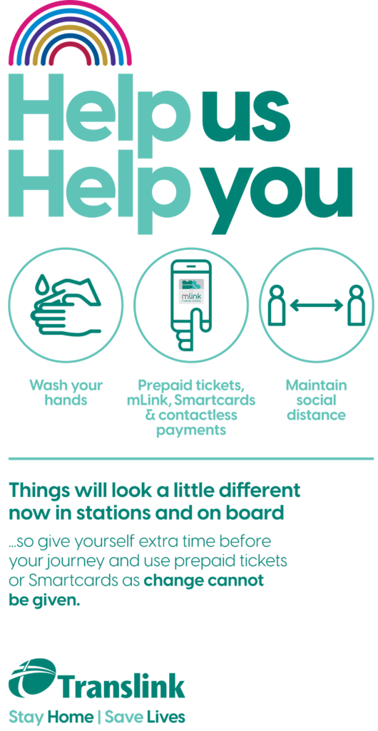 Safety continues to be our top priority and we have introduced a range of additional measures in bus and rail stations to help keep everyone safe. These include new social distancing signage in stations and on board vehicles, regular deep cleaning of vehicles and facilities, use of mobile cleaning teams during operational service, erection of screens to reduce staff and passenger interaction and providing hand sanitiser and gloves to front line staff. We’re also providing hand sanitiser facilities for passengers in stations across Northern Ireland and will be introducing systems and procedures where appropriate in our stations to facilitate social distancing further.