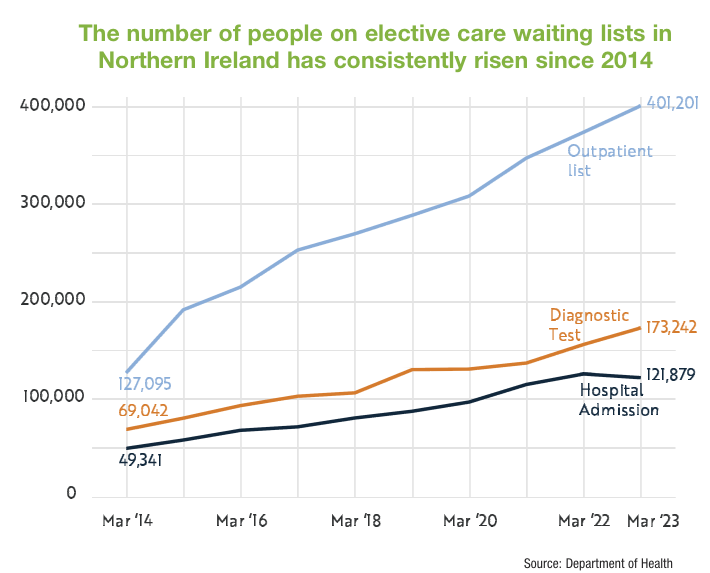 The waiting list crisis in Northern Ireland is evidenced by a 185 per cent rise in the number of patients waiting for either an initial outpatient appointment, inpatient treatment, or diagnostic test over the last nine years. While there were 244,000 people waiting in March 2014, this figure increased to 696,000 patients as of March 2023.