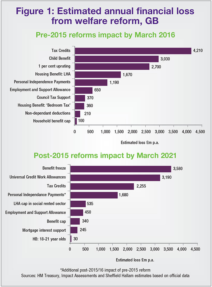 The scale of the changes in Britain are significant in both parliaments and include 18 major reforms overall (Figure 1). In addition, the Universal Credit system for a single real time payment system covering all income-related working age benefits is being introduced. The pre-2015 reforms equate to cuts of £14.5 billion per year by March 2016 and an additional £11.7 billion per year cut by early 2021. Claimants are therefore expected to have lost a cumulative total of more than £26 billion a year as a result of the welfare reforms implemented since 2010. This is the level of additional support that would have been available to low income families had the reforms not have been made. This is rather more than £1 in every four previously paid to working-age benefit claimants and equivalent to £660 a year for every adult of working age (claiming benefits or not) across the whole of Britain. The scale of cuts is unprecedented and impacts on the local economies of the communities where those affected live, as well as the individuals themselves.