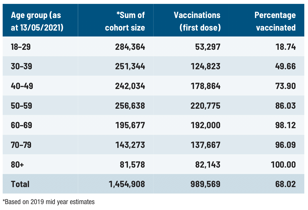 However, the Department’s Covid-19 vaccination dashboard does display levels of first dose vaccine uptake. The size of the cohorts in age category appears to be based on older information, for example, more first doses of the vaccine have been issued to the over 80s than the size of the cohort identified by the Department, but the data does give an indication of the levels of uptake amongst various age groups.