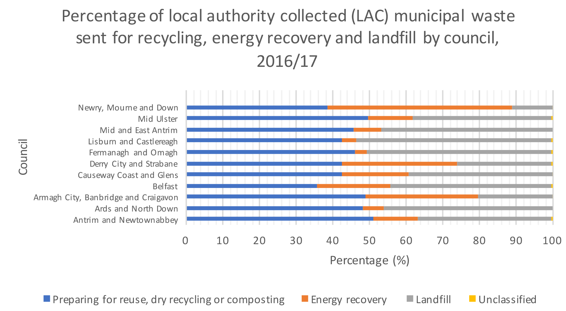 LACMW energy recovery was 18.5 per cent, slightly up (0.9 per cent) on the previous year, the highest rate being in Newry, Mourne and Down (50.4 per cent) and the lowest in Fermanagh and Omagh (3.1 per cent).