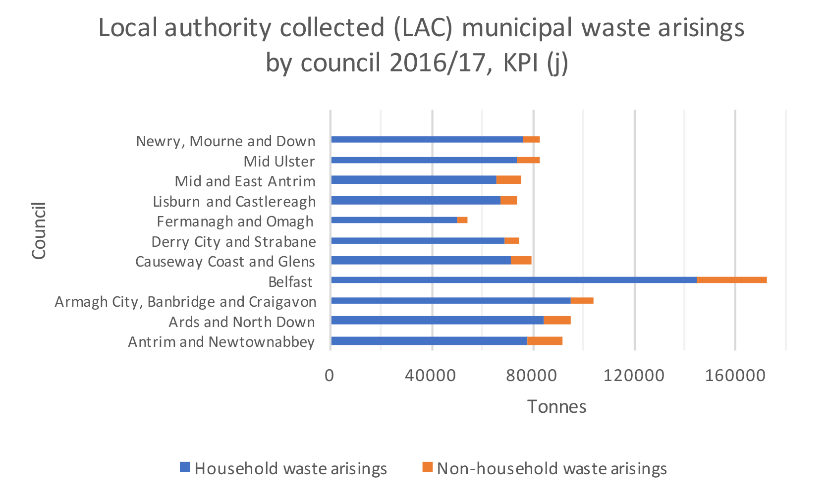 The proportion of LACMW collected broadly mirrors council population. For instance, in 2016/17, Belfast had the greatest waste arisings representing 17 per cent of the total waste arising in area which incorporates 18 per cent of the total population. Reflecting the concentration of business, Belfast also had the greatest proportion of non-household LACMW arisings (25 per cent). At the opposite end of the spectrum, Fermanagh and Omagh had the lowest waste arisings representing 5 per cent of the total waste arising in a local government area home to 6 per cent of the population.