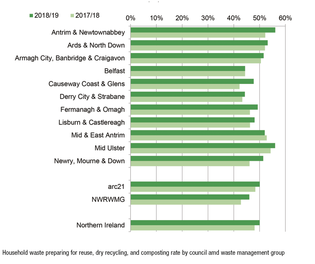 Nine councils reported increased household recycling rates compared to 2017/18. The lowest household waste recycling rates were recorded in Derry City and Strabane at 44.3 per cent, and Belfast at 44.4 per cent. The highest household waste recycling rates were recorded in Antrim and Newtownabbey and Mid Ulster at 56.1 per cent and 56.0 per cent respectively.